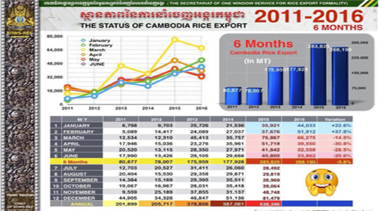 The report stated that in March 2016, Cambodia's rice exports fell by 14.5 percent meaning more than 7.5 million tons of rice has fallen in 2015 to only 6.6 tons in 2016; later in April, the exports faced another drop by 30.8 percent (5.1 to 3.9 tons). In May, the exports also experienced a slump by 28.5 percent (from 4.1 million down to 3.2 million tons), followed by the other continuous downturn of 20.6 percent in June (from more than 4 thousand to just over 3.3 tons).