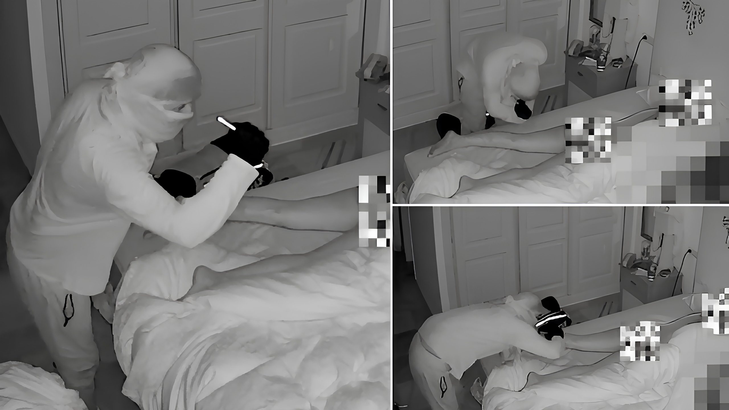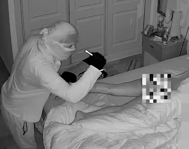But while the couple reviewed their CCTV, they made an even more disturbing discovery after footage showed how a masked thief stood over their bed as they slept.